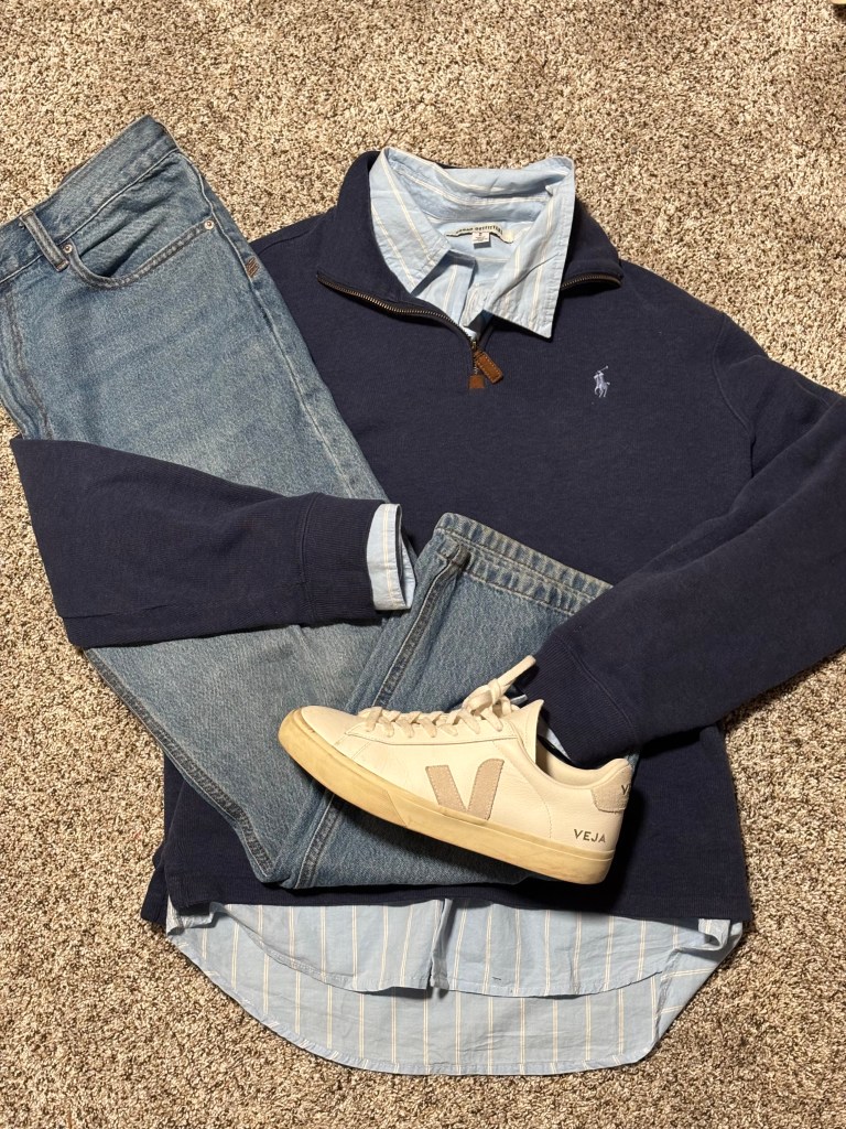 Button Up: Urban Outfitters | Quarter-Zip: Thrifted Ralph Lauren | Jeans: BDG Straight Fit | Shoes: Veja Campo (Again)