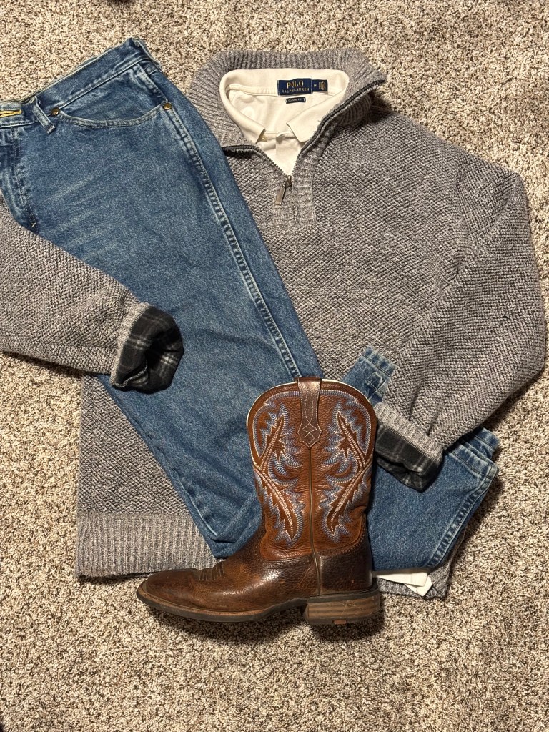 Sweater: Thrifted Quarter-Zip | Polo: Thrifted Ralph Lauren | Jeans: Wrangler George Strait Fit | Boots: Ariat